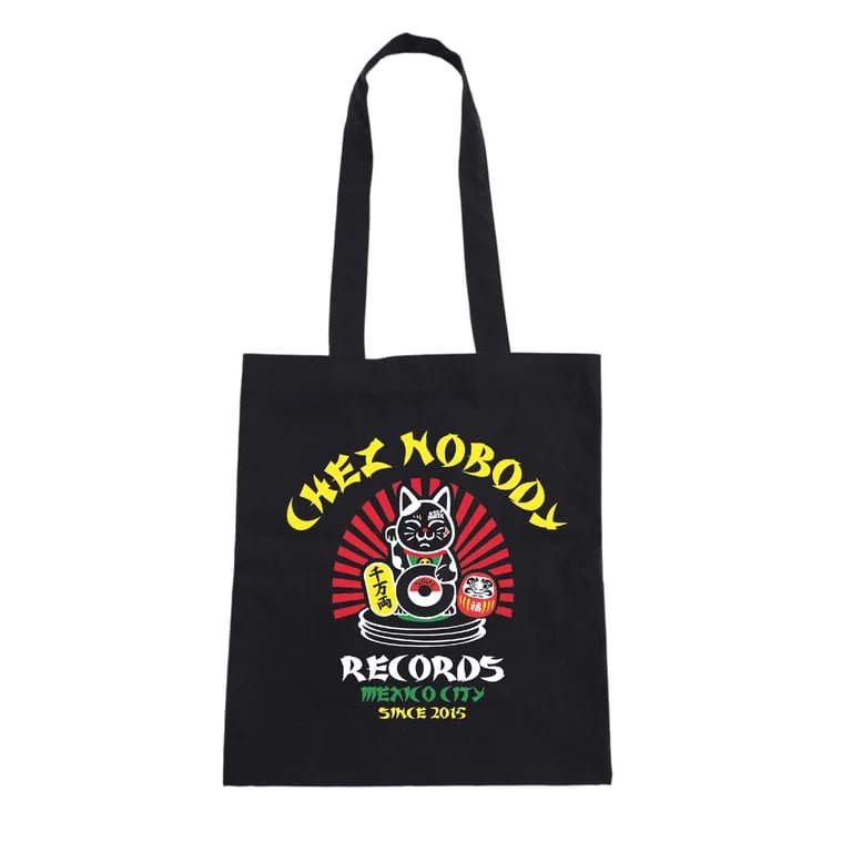 Black canvas tote bag (perfect for holding vinyl LPs) printed with Chez Nobody logo design. Illustration by Moises Chez.